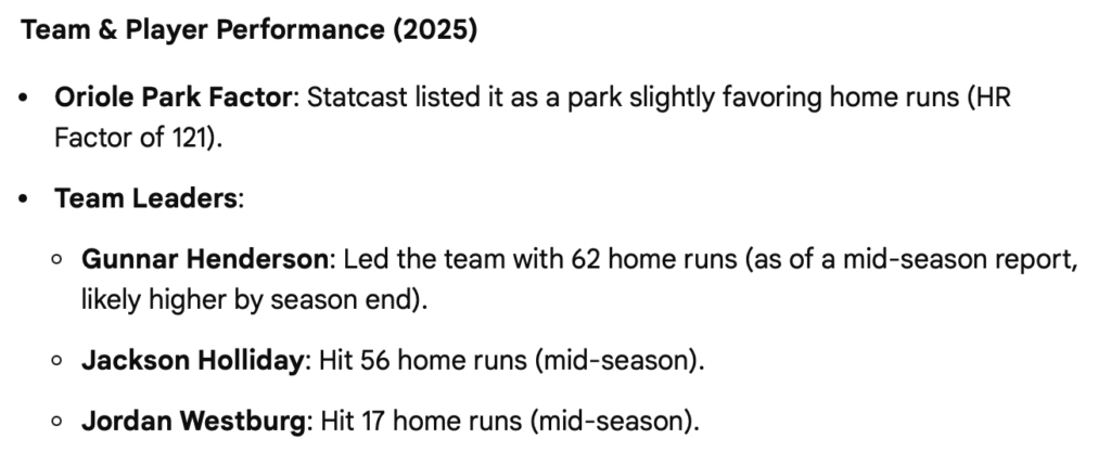 (An aside: AI is proving to be wildly inaccurate when it comes to baseball stats. Google AI reported the following on Orioles homers in 2025: